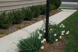 Here is the front of the house. It has been a long slog to get these beds not looking shabby and empty. At this point we really just need the hollies and boxwood to mature and fill in and the perennials to have another year to get excellent root systems in place to look their best. You can see roses, day lilies, lamb's ear, tulips, sedum, phlox, fountain grass and much more popping up. The tulips are especially gorgeous with a soft cream variegated with light pink.
